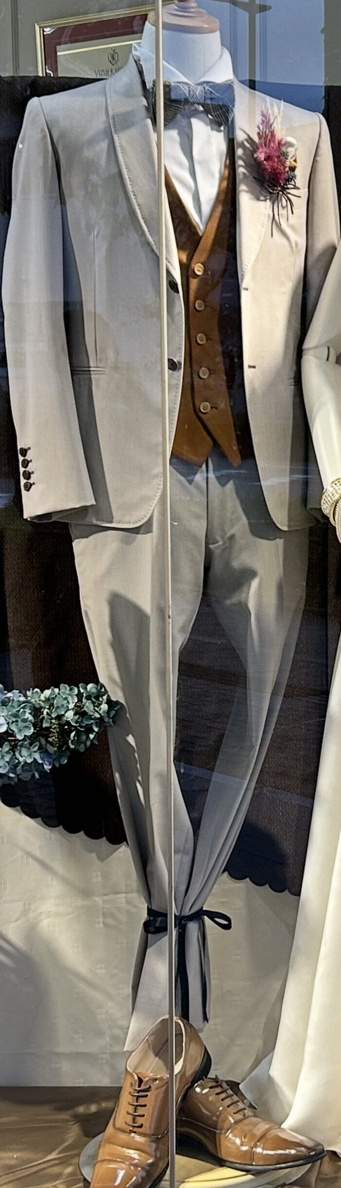 ベストのオレンジ色がほどよく差し色になっていて、チェック柄の蝶ネクタイとブラウンの靴が全体をおしゃれにまとめています👞✨