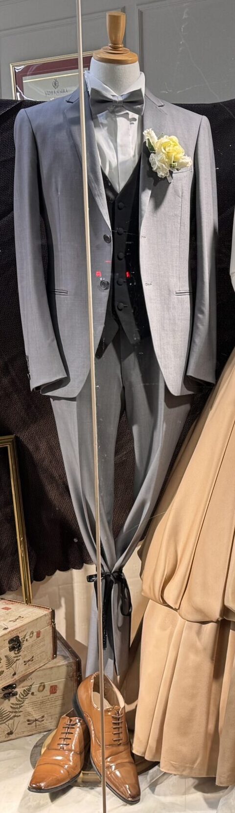 タキシードはドレスの柔らかいトーンに合わせたグレー💍