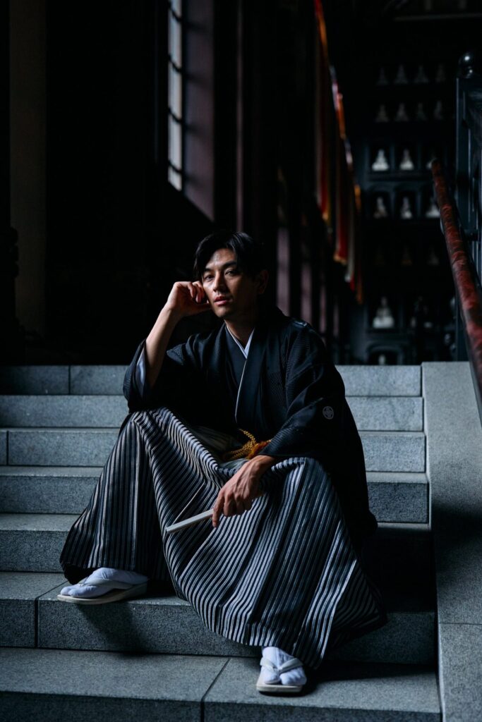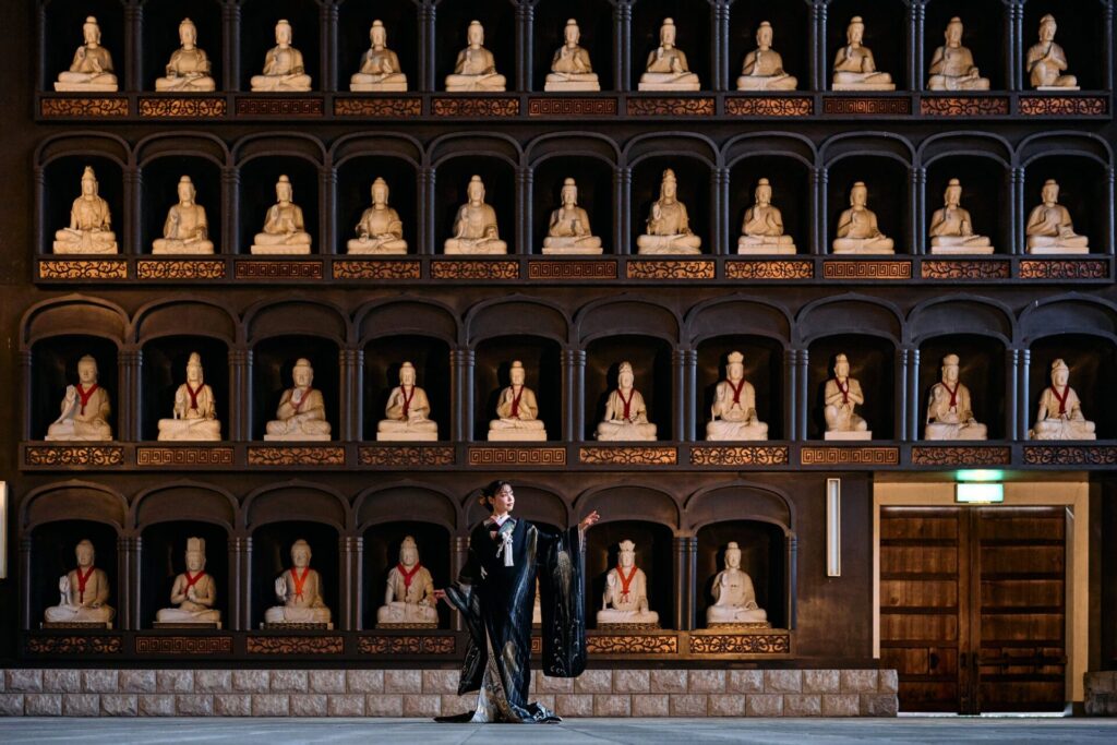 ずらりと並ぶ仏像の背景は、伝統的な着物の柄や色彩をより一層引き立ててくれます。