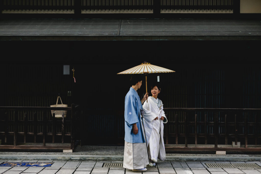 直線的な道路と奥行きのある背景が花嫁の姿をより引き立て、紋付袴姿の新郎をいっそう堂々と見せてくれます。